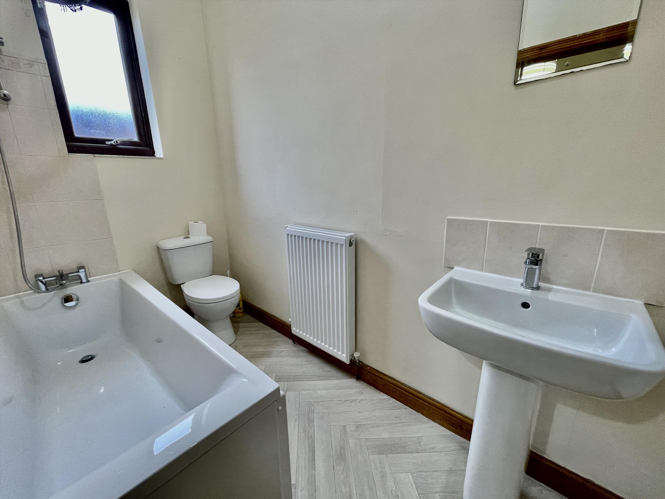 Upstairs, there are two double bedrooms and one single, and a modern three-piece suite bathroom with showerhead over bath.