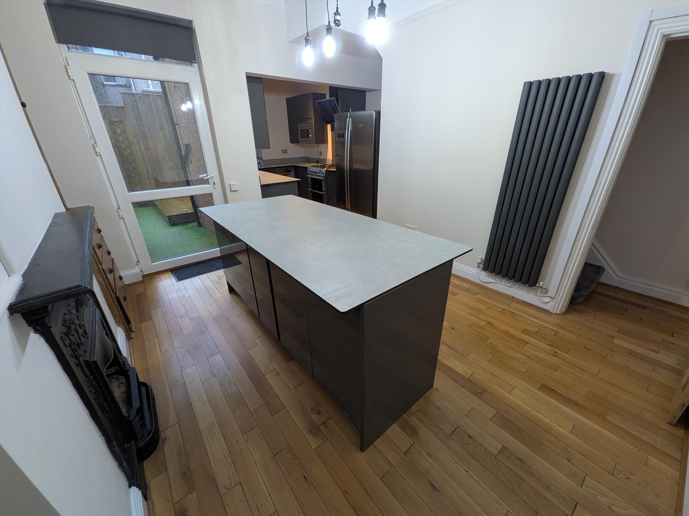 This stunning forecourted terrace offers a modern lounge with wood flooring and log fire. Moving through the property, there is an open living dining and kitchen area with island. The kitchen offers a modern finish with vinyl metallic grey cupboard finish. There is under stairs storage. Access to the yard area is from the dining room.