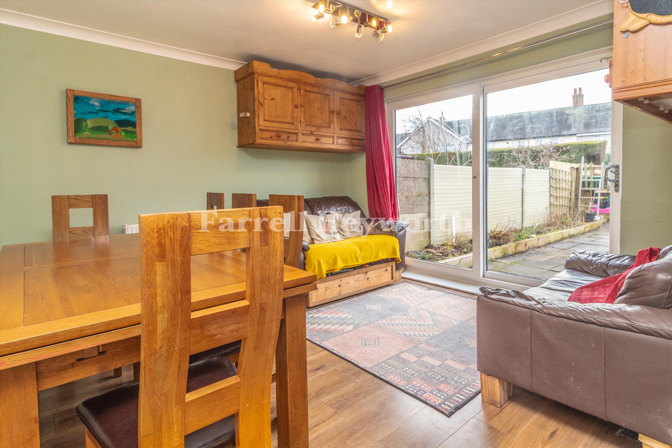 Internally the well-presented accommodation comprises; Entrance porch, hallway, modern three piece bathroom, ground floor double bedroom, generous lounge, dining room with patio doors lending access into the rear garden, open to the good sized kitchen with ample units, built-in oven and hob and space for white goods, and has a personal door into a generous sized store room.