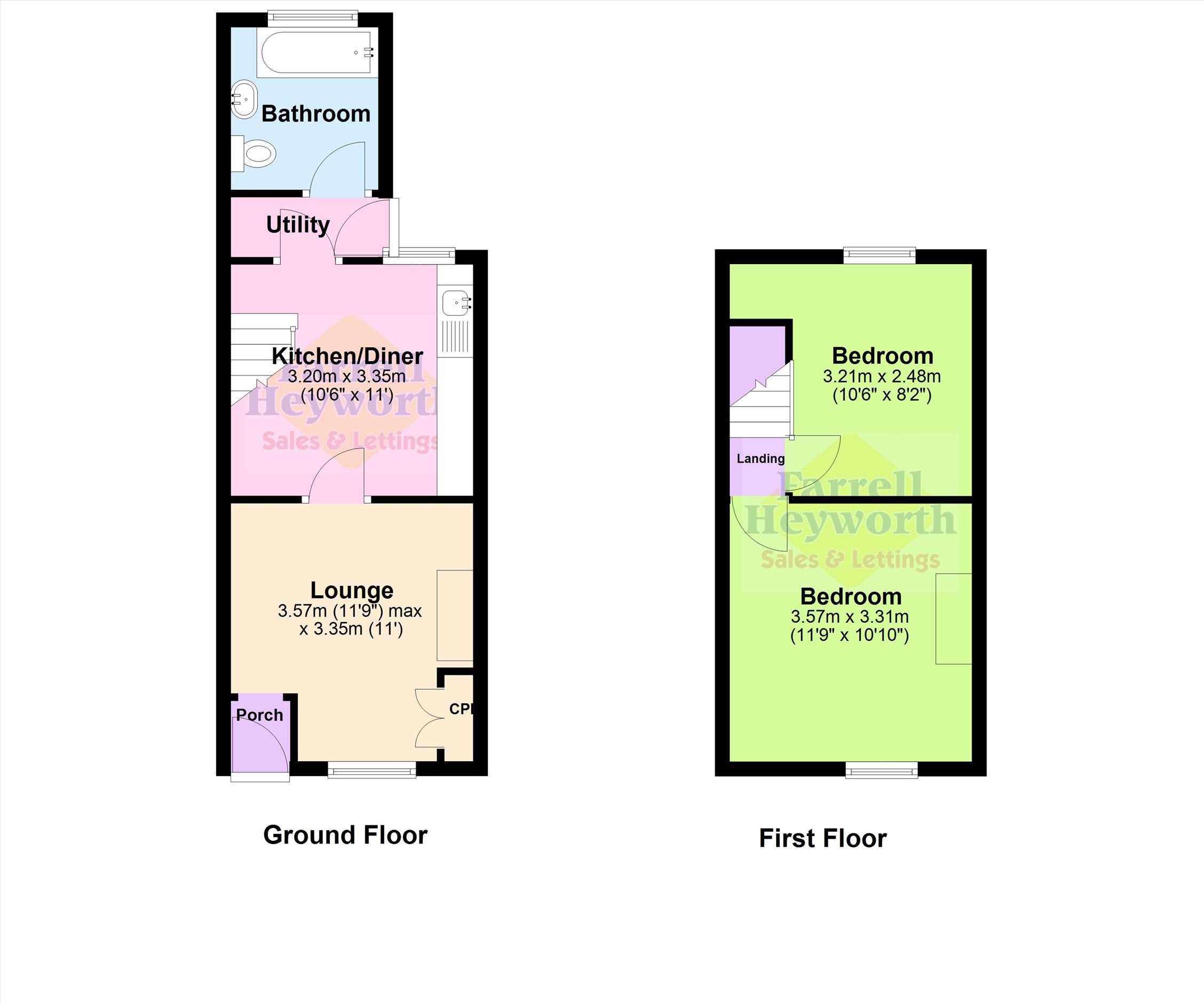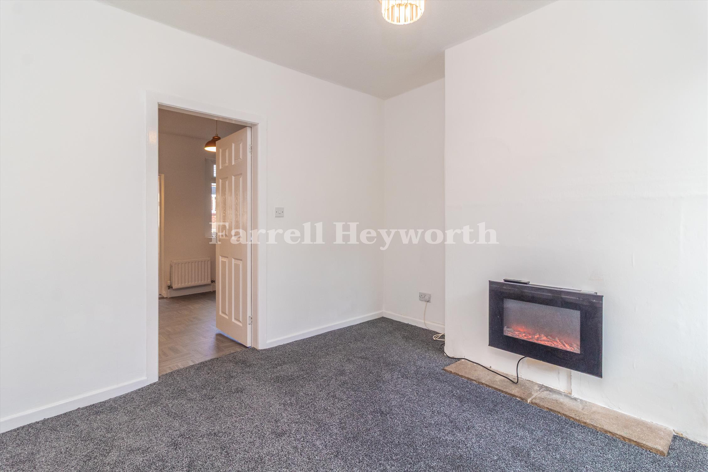 Comprises: Vestibule, lounge with electric fire, kitchen/diner with fitted wall and base units, three piece ground floor bathroom and two double bedrooms to the first floor.