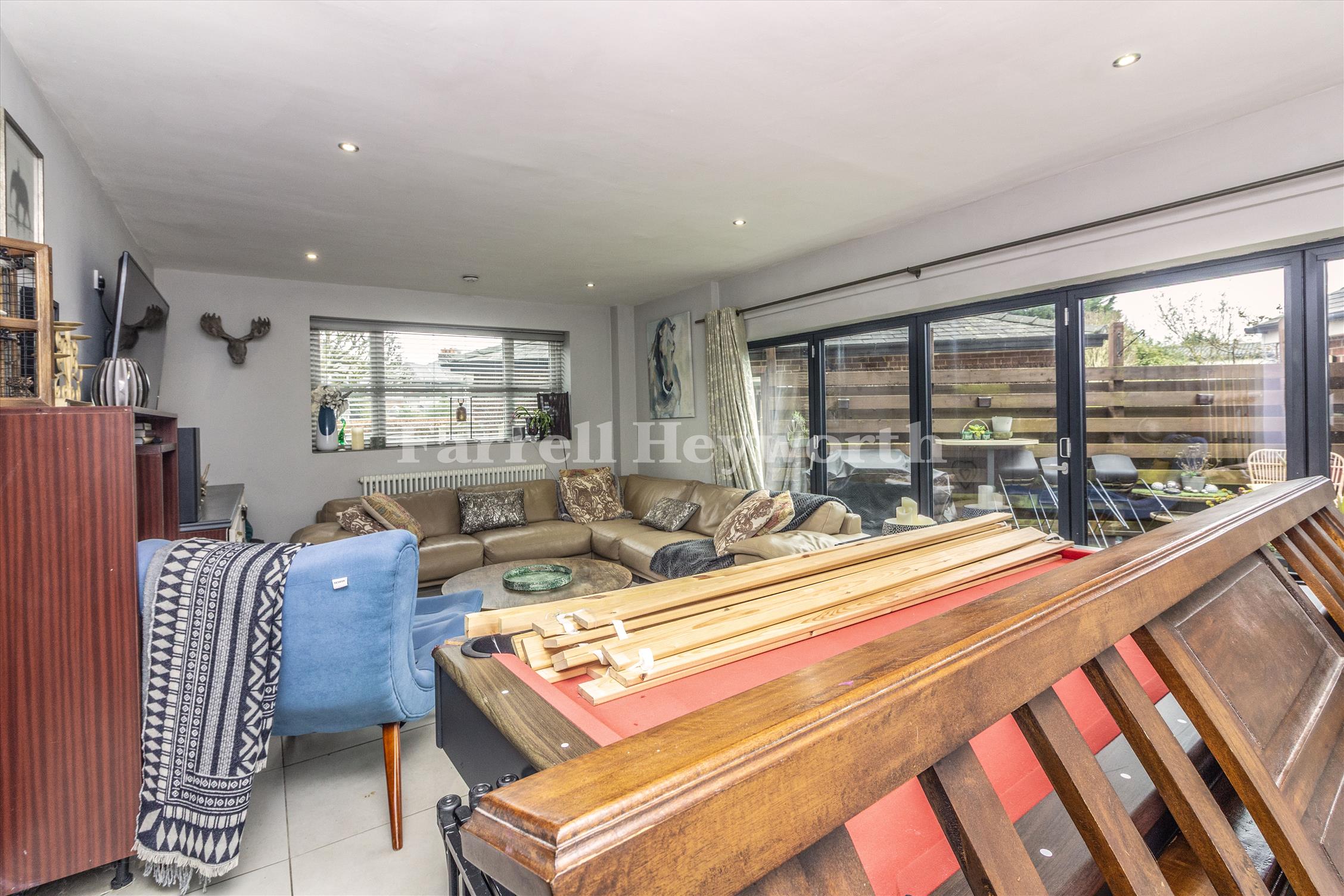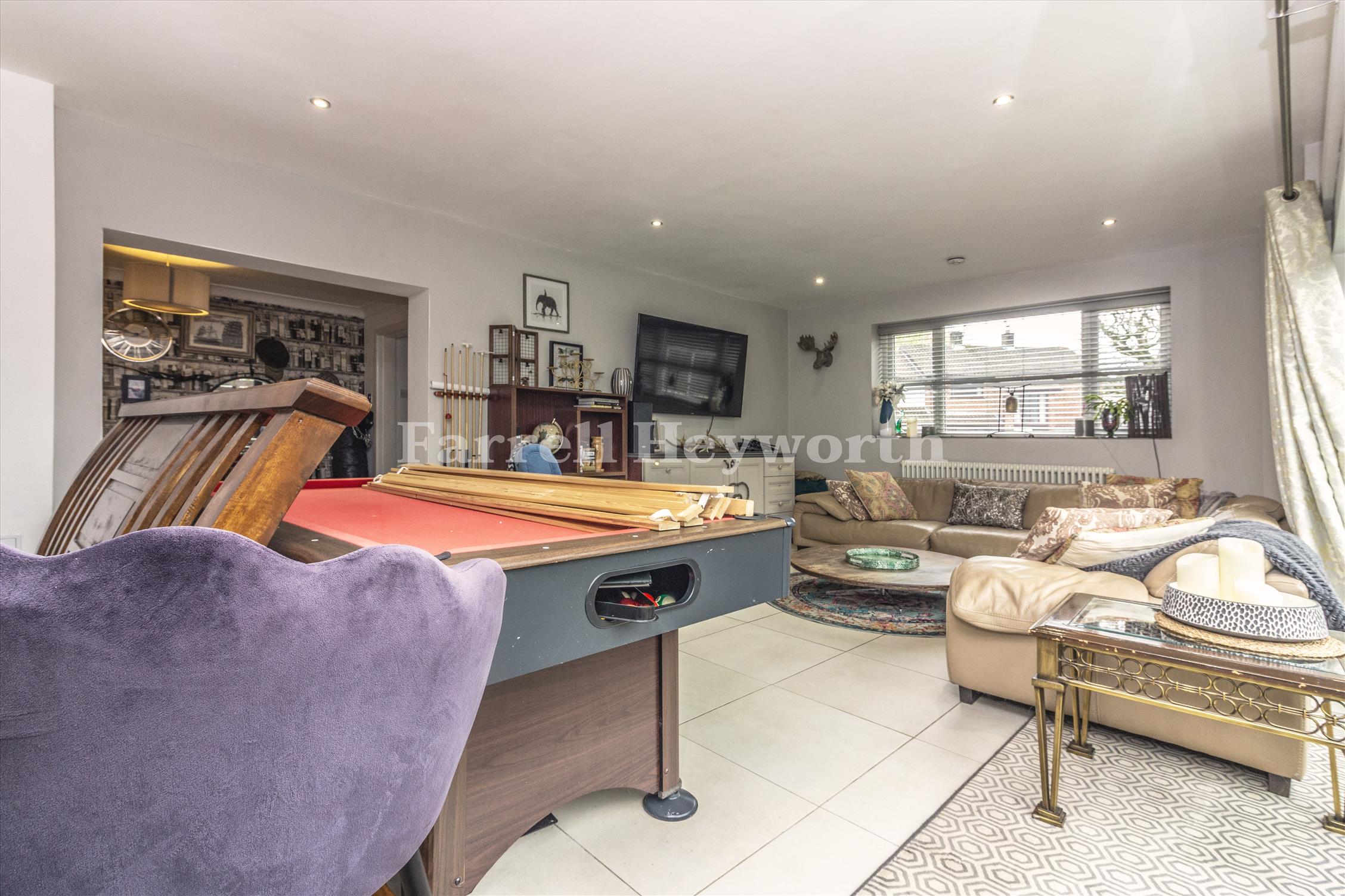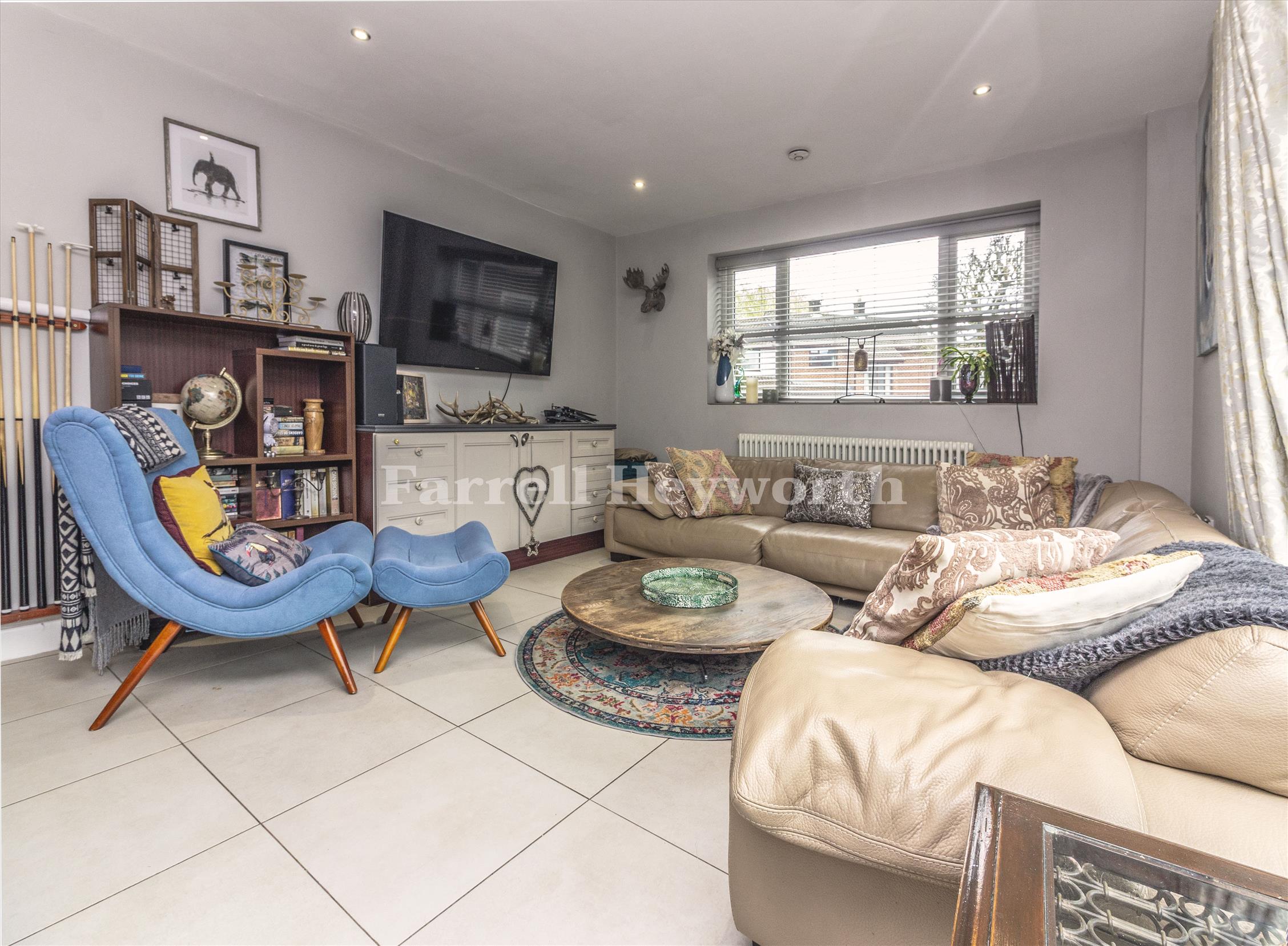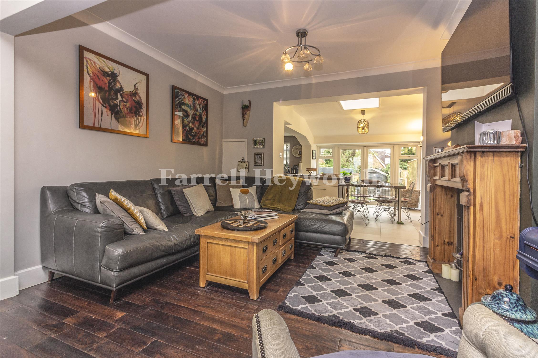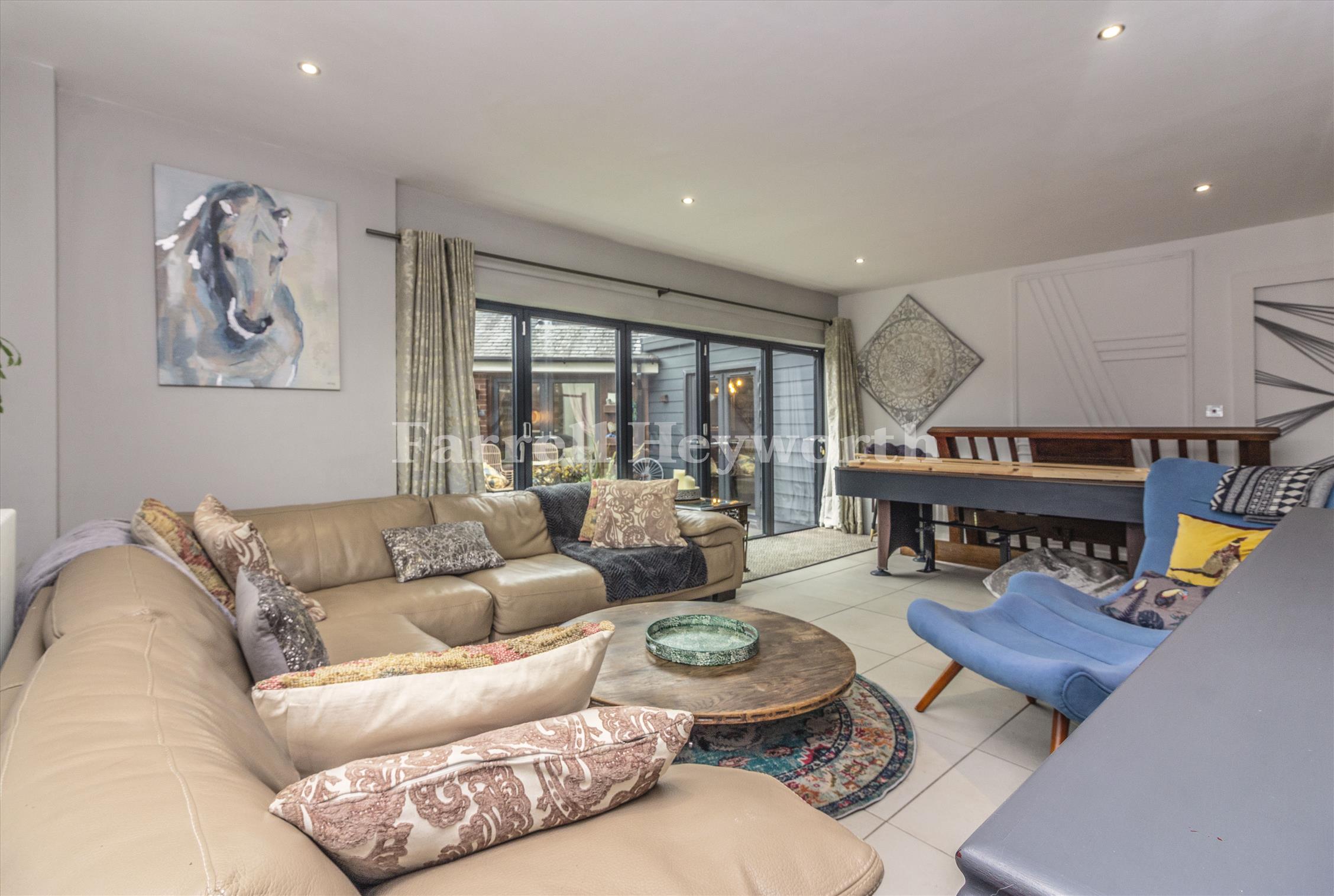 Welcoming porch leading into a bright and spacious entrance hall. Impressive open-plan lounge and dining room, perfect for family life and entertaining. Separate study. Additional side reception room featuring bi-folding doors opening onto the side garden. Generous modern breakfast kitchen fitted with a range of contemporary units and integrated appliances, offering excellent storage and workspace.
